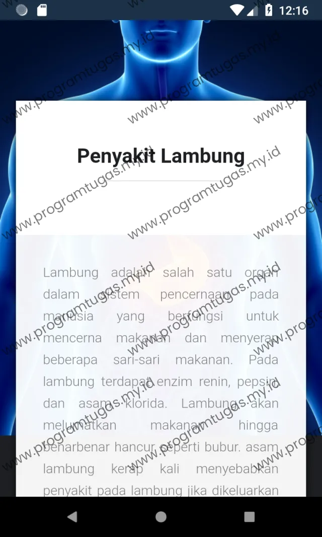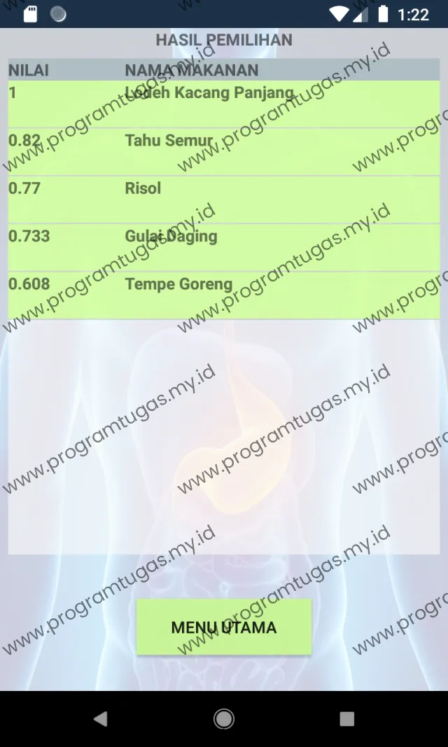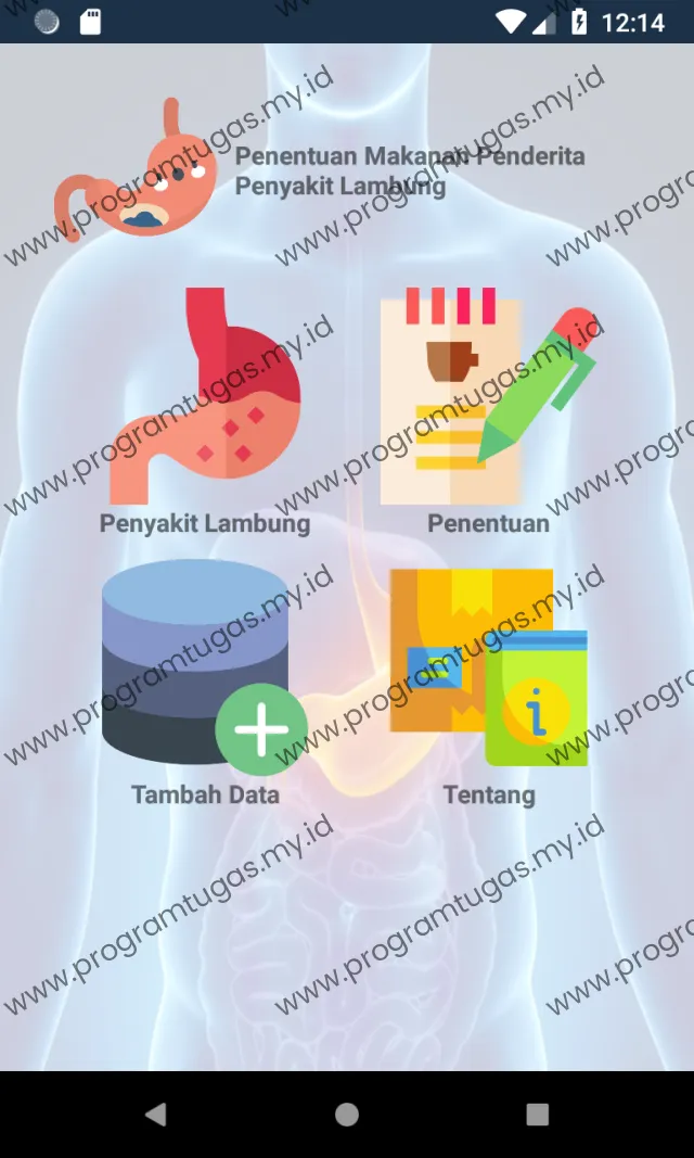 Aplikasi sistem pendukung keputusan menentukan makanan bagi penderita penyakit lambung terdiri atas tampilan pemilihan, data makanan dan tentang.