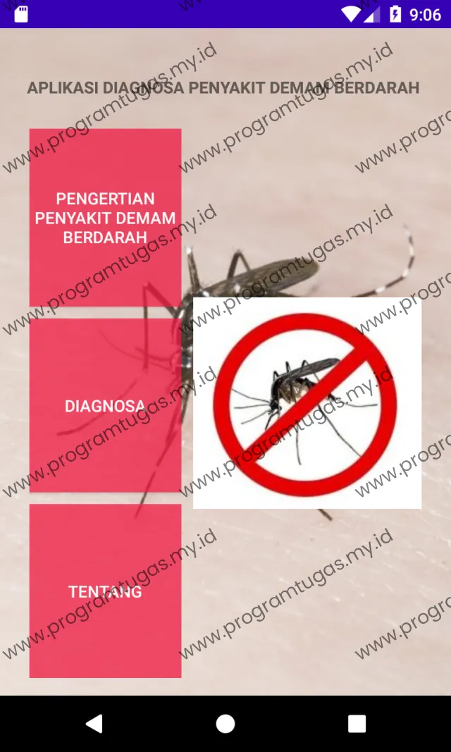Program aplikasi android dengan java sebagai bahasa pemrogramannya. Didalam aplikasi tersebut, pengguna hanya tinggal menjawab pertanyaan yang diberikan oleh aplikasi. Kemudian aplikasi akan memberikan jawaban dari pertanyaan apakah terserang penyakit demam berdarah atau tidaknya. Hasil dari jawaban yang diberikan oleh aplikasi dilengkapi dengan solusi dan nilai persentase