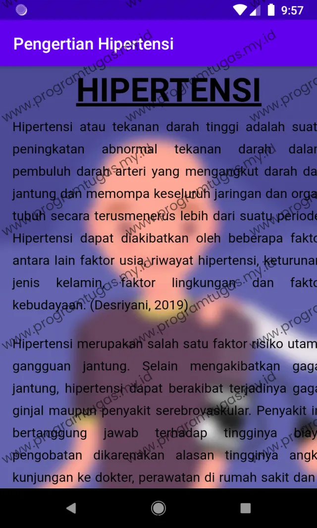 Aplikasi pemilihan makanan penderita hipertensi berbasis android dengan C# sebagai bahasa pemrogramannya. Didalam aplikasi tersebut, pengguna hanya memilih makanan-makanan yang akan dikonsumsi kemudian aplikasi akan melakukan kalkulasi berdasarkan nilai dari kriteria makanan tersebut. Sehingga didapatkan hasil dari seleksi makanan yang dipilih sebelumnya.