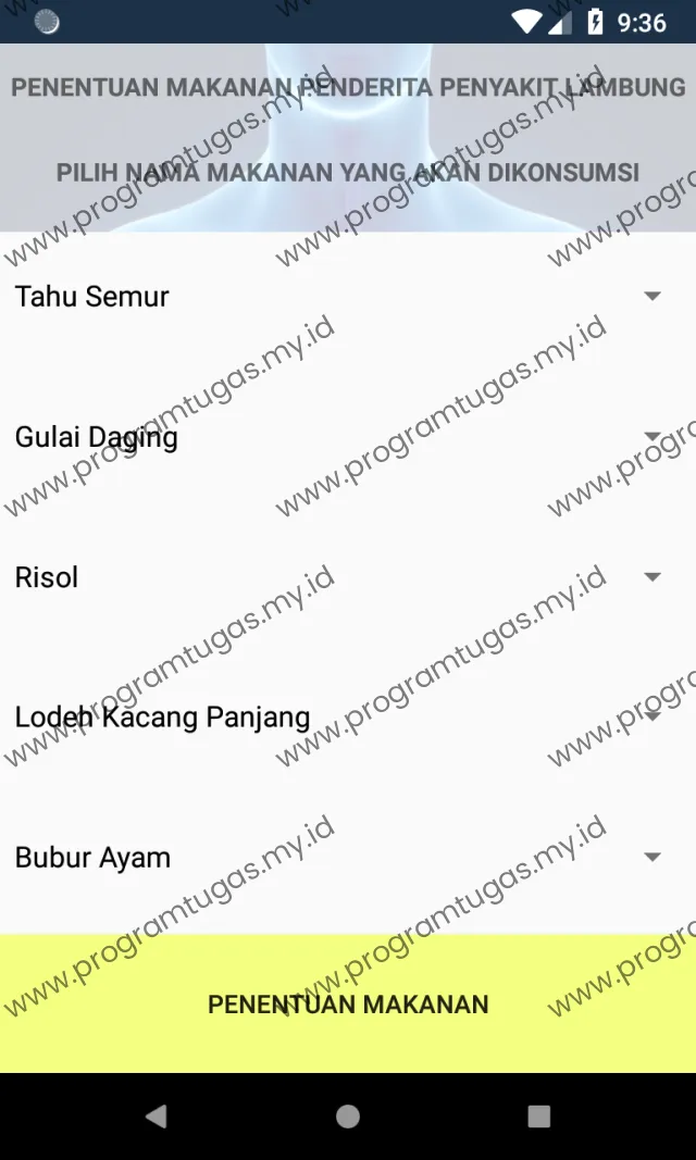 Aplikasi sistem pendukung keputusan menentukan makanan bagi penderita penyakit lambung terdiri atas tampilan pemilihan, data makanan dan tentang.