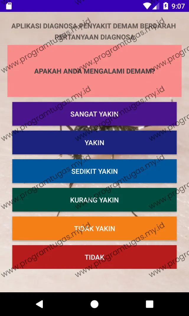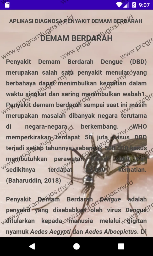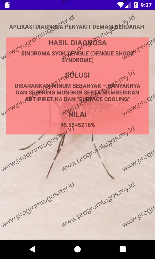 Program aplikasi android dengan java sebagai bahasa pemrogramannya. Didalam aplikasi tersebut, pengguna hanya tinggal menjawab pertanyaan yang diberikan oleh aplikasi. Kemudian aplikasi akan memberikan jawaban dari pertanyaan apakah terserang penyakit demam berdarah atau tidaknya. Hasil dari jawaban yang diberikan oleh aplikasi dilengkapi dengan solusi dan nilai persentase