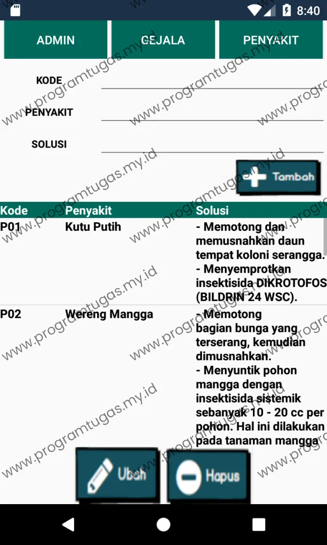 - Program ini hanya untuk ruang lingkup keperluan: skripsi, tugas akhir, tugas mahasiswa dan bukan untuk versi live/publish/produksi. Sehingga bug, efisiensi, keamanan dan stabilitas sistem tidak di utamakan. Untuk pembuatan program yang mengutamakan efisiensi, keamanan dan stabilitas sistem, silahkan klik disini.