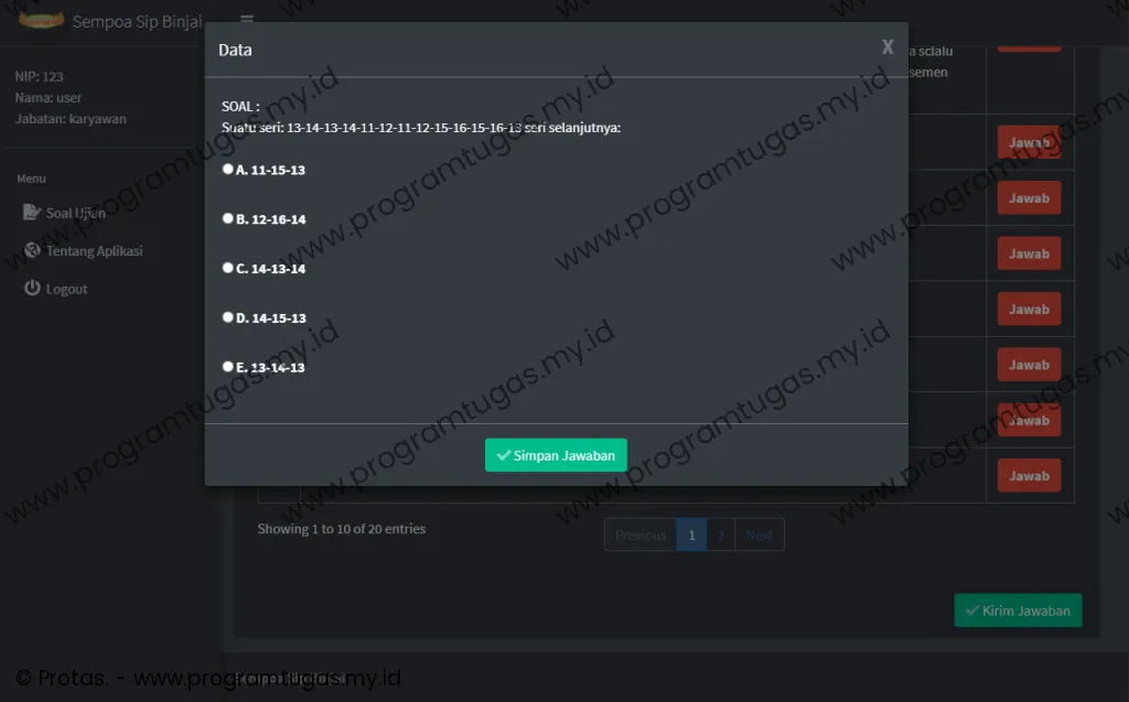 - Program ini hanya untuk ruang lingkup keperluan: skripsi, tugas akhir, tugas mahasiswa dan bukan untuk versi live/publish/produksi. Sehingga bug, efisiensi, keamanan dan stabilitas sistem tidak di utamakan. Untuk pembuatan program yang mengutamakan efisiensi, keamanan dan stabilitas sistem, silahkan klik disini.